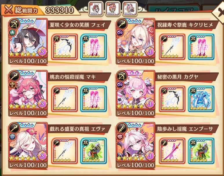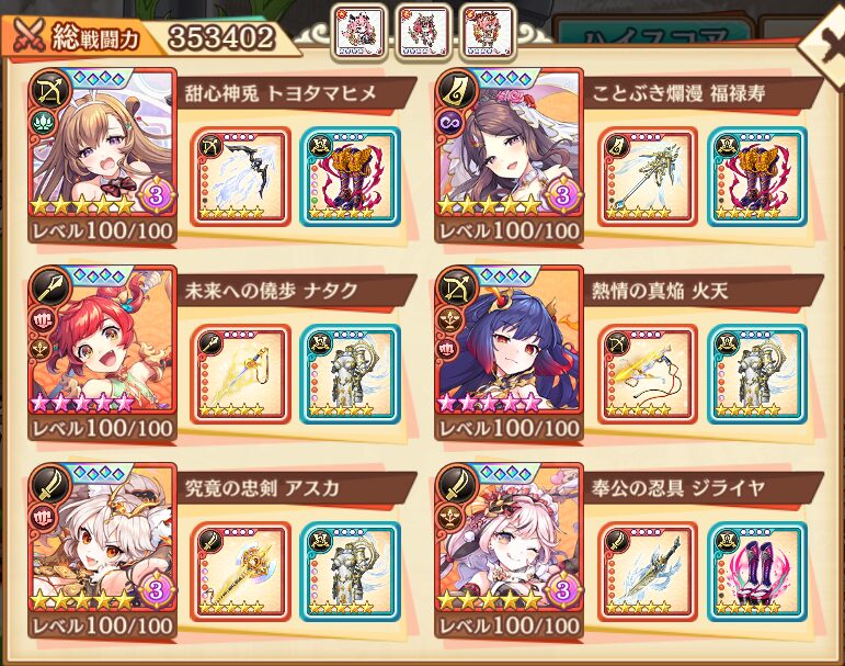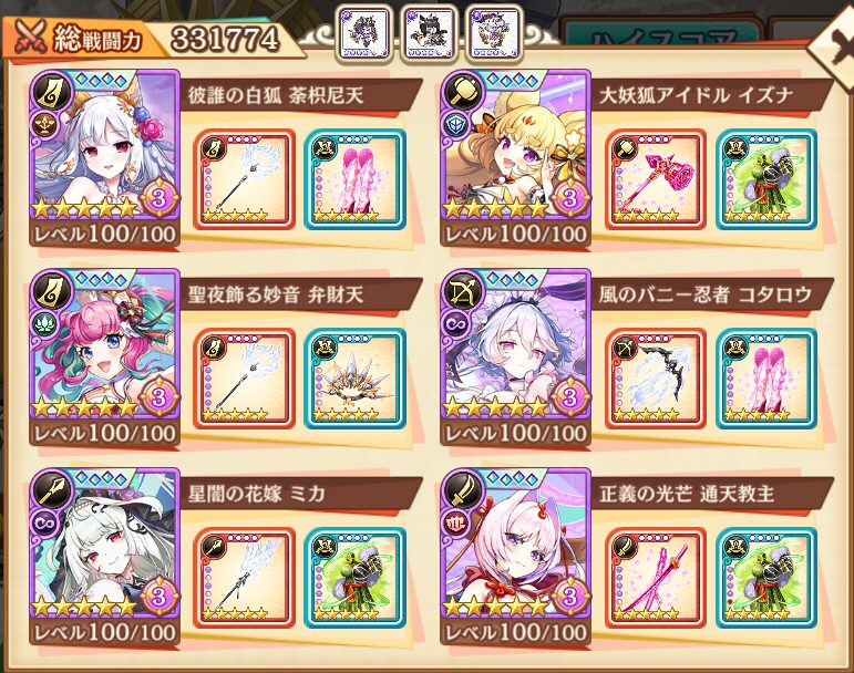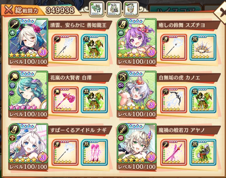 すぱーくるアイドル ナギの代わりに夢枕の樅樹 コトハ花嵐の大賢者 白澤の代わりに浜辺の天使 ミカエル承願の玄帝 ミズノエを編成してもレベル350を3Pで倒せるようです.