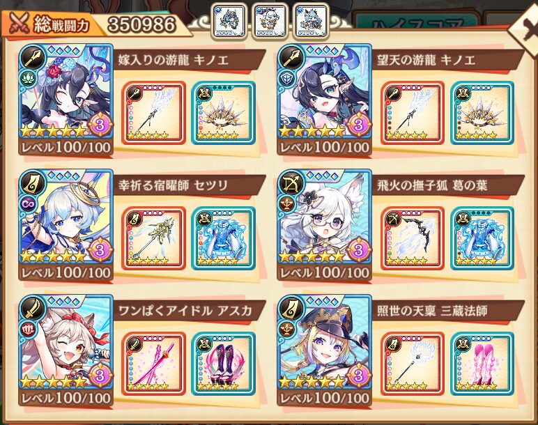 幸祈る宿曜師 セツリの代わりに汀の想花 ナギを編成してもレベル350を3Pで倒せるようです.
