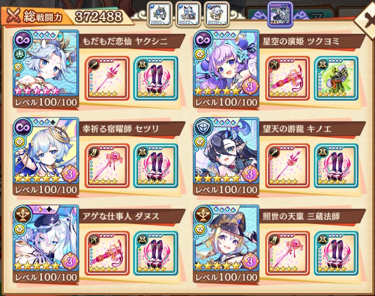 編成は1Pの通常攻撃編成の照世の天稟 三蔵法師をワンぱくアイドル アスカに変更したものです.