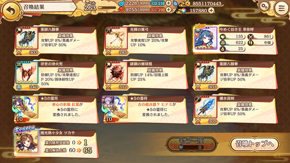 装備は少し残念でしたが,今めく旧き王 卑弥呼を引けたのは嬉しいです.