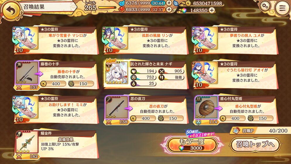 今回は40連で[託された輝きと未来] ナギを入手しました.