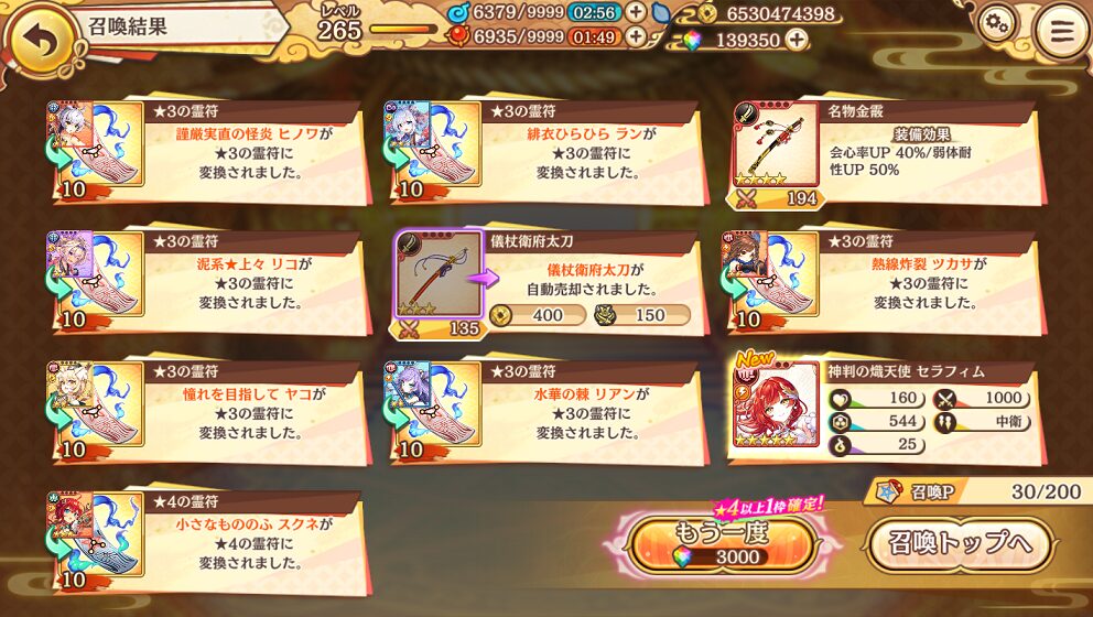 今回は30連で[神判の熾天使] セラフィムを入手しました.
