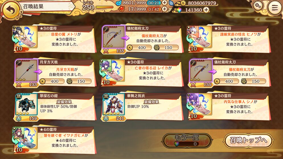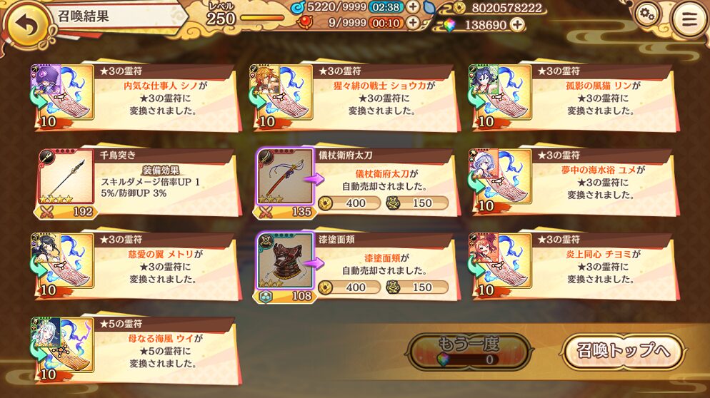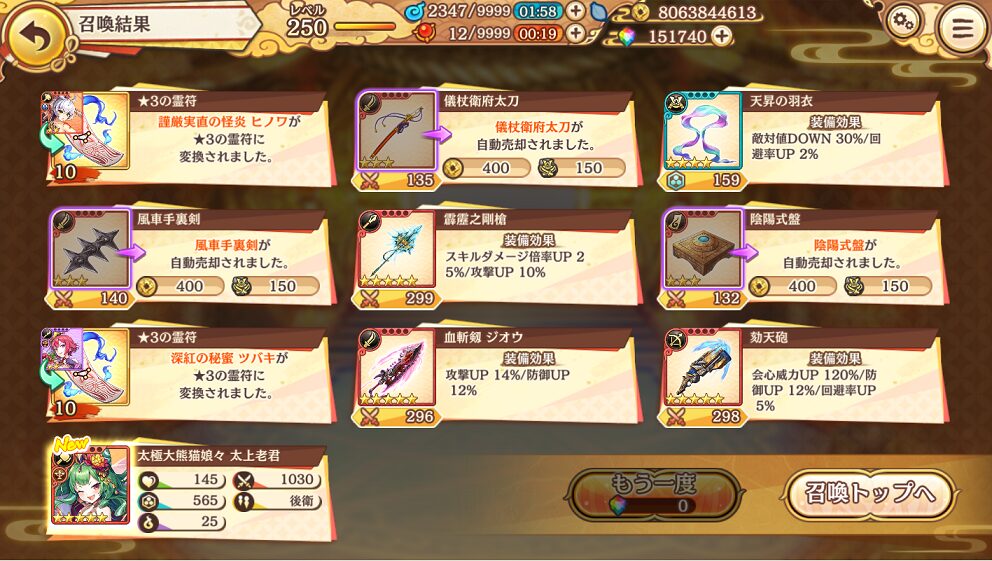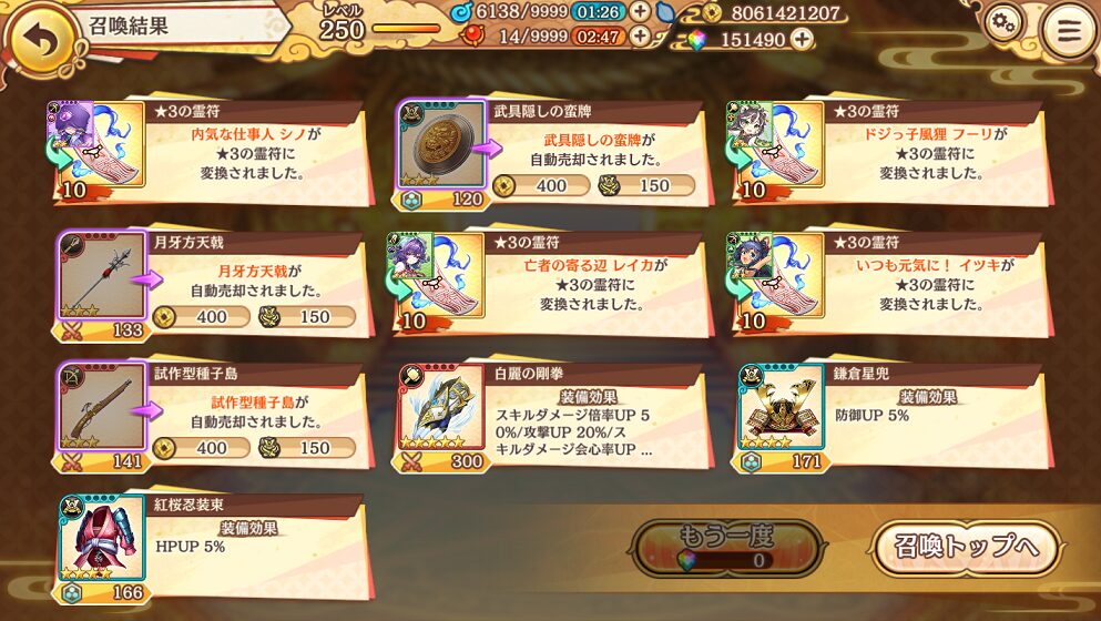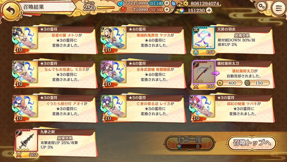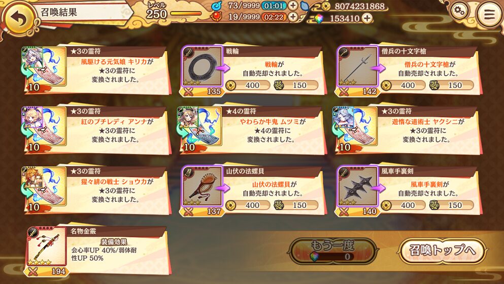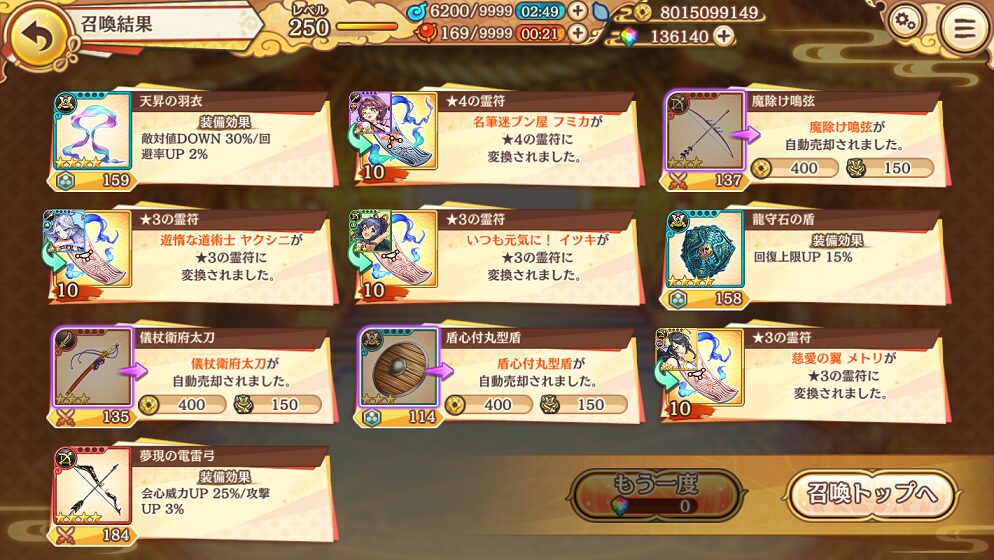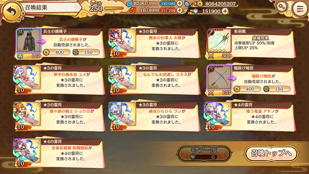 無料ガチャ190連で当たった★5は式神8体&装備6個でした.