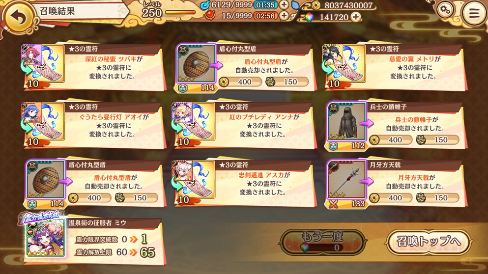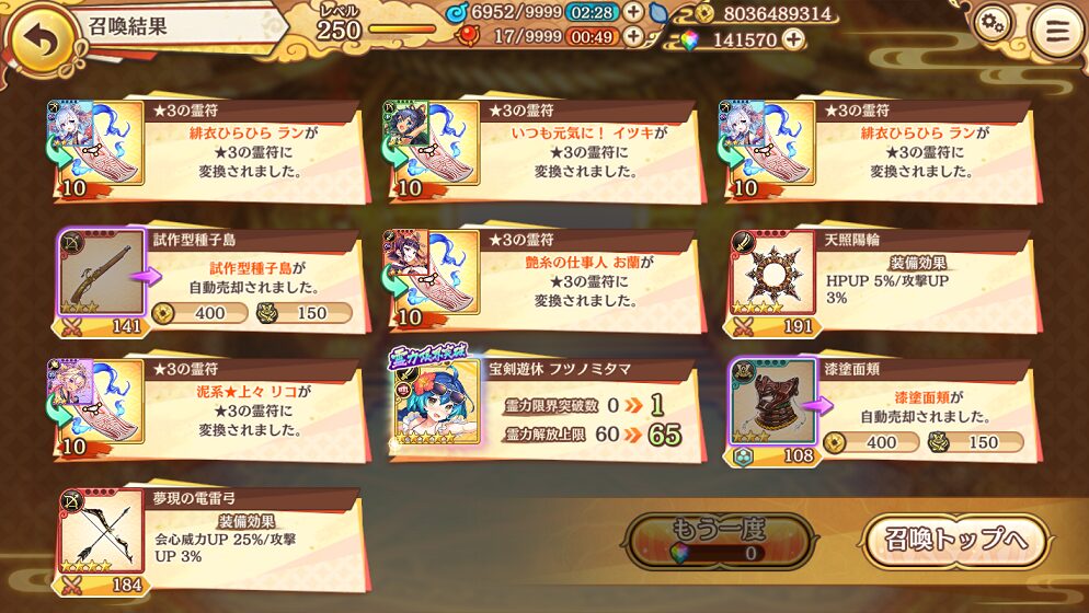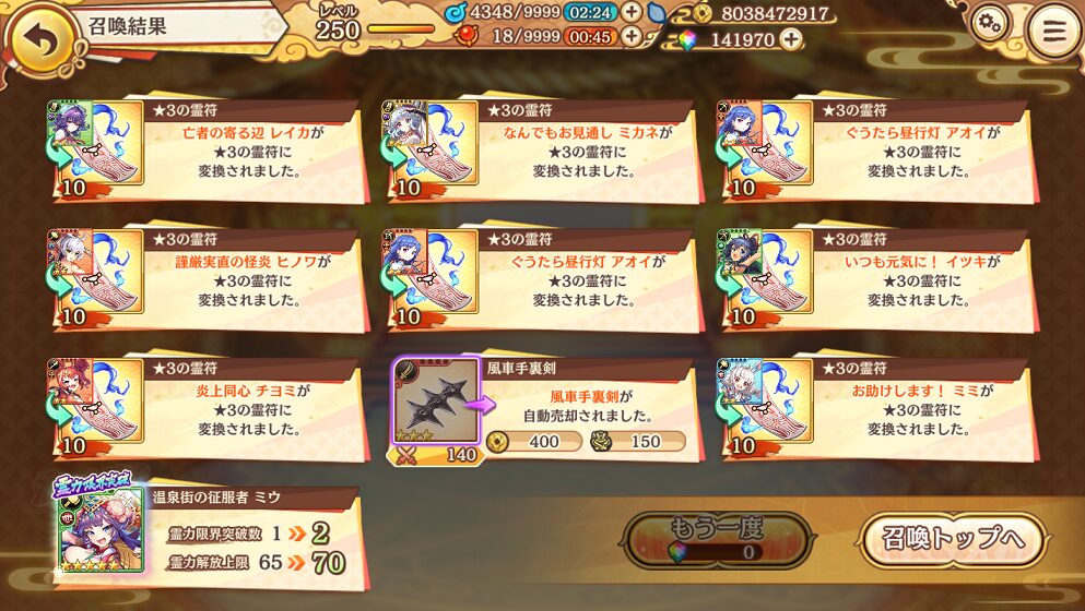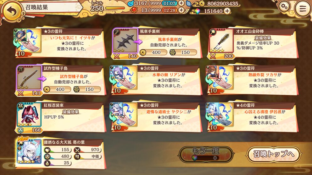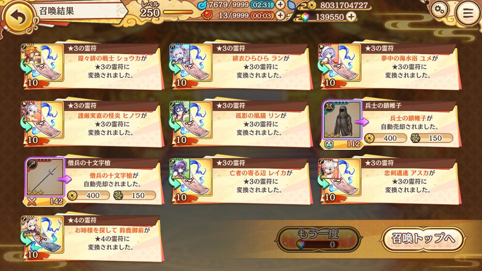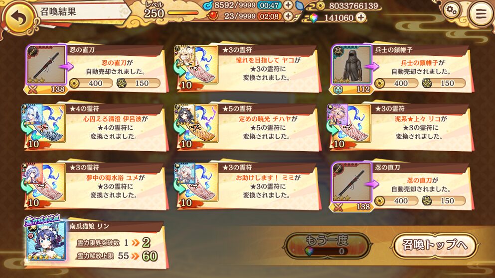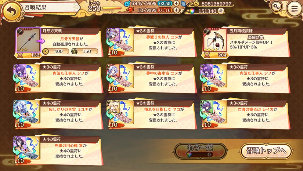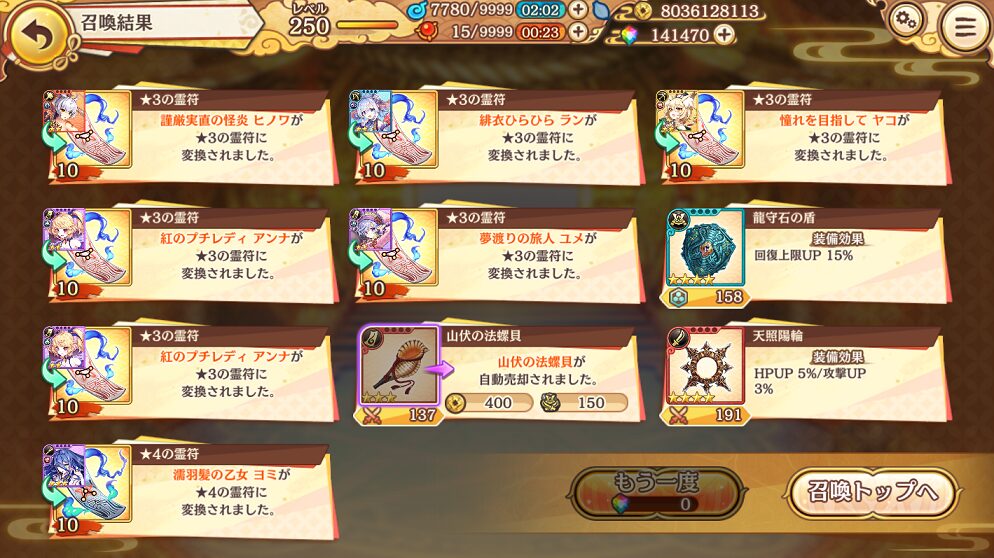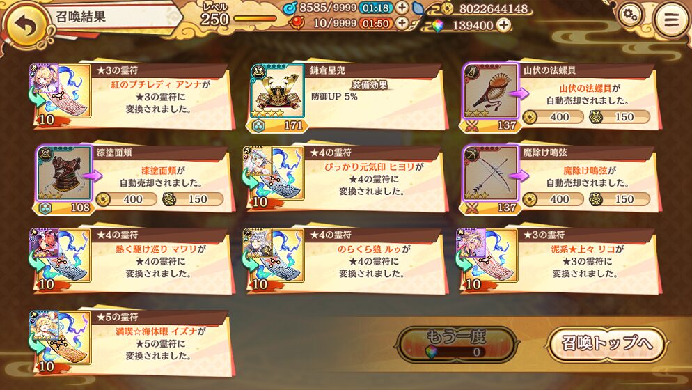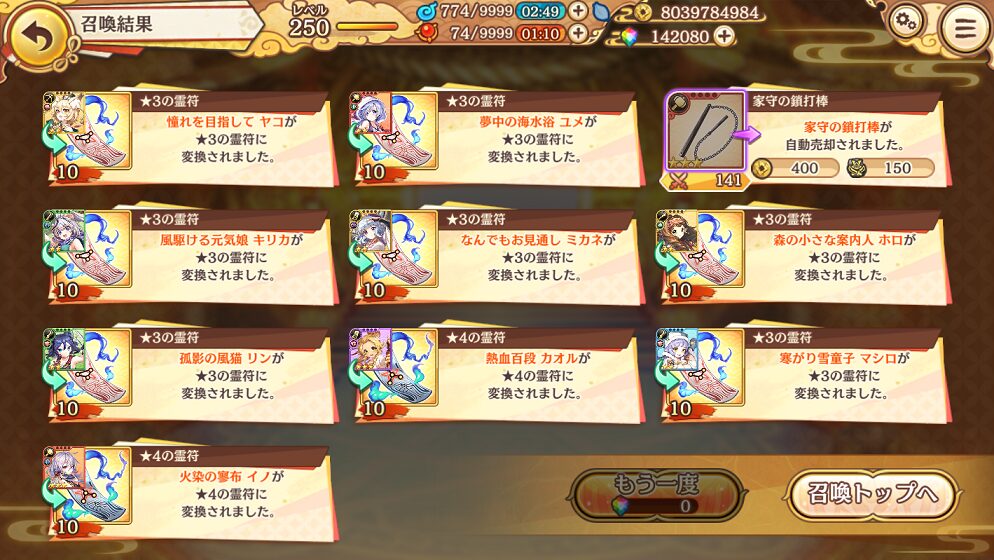 せめて,銭貨召喚で入手できる★5式神くらいはコンプリートしたいものです.