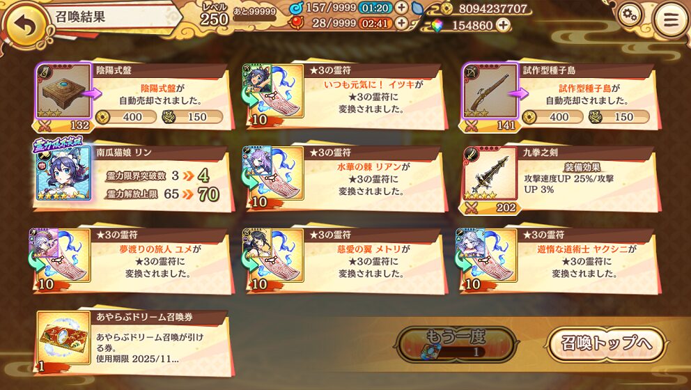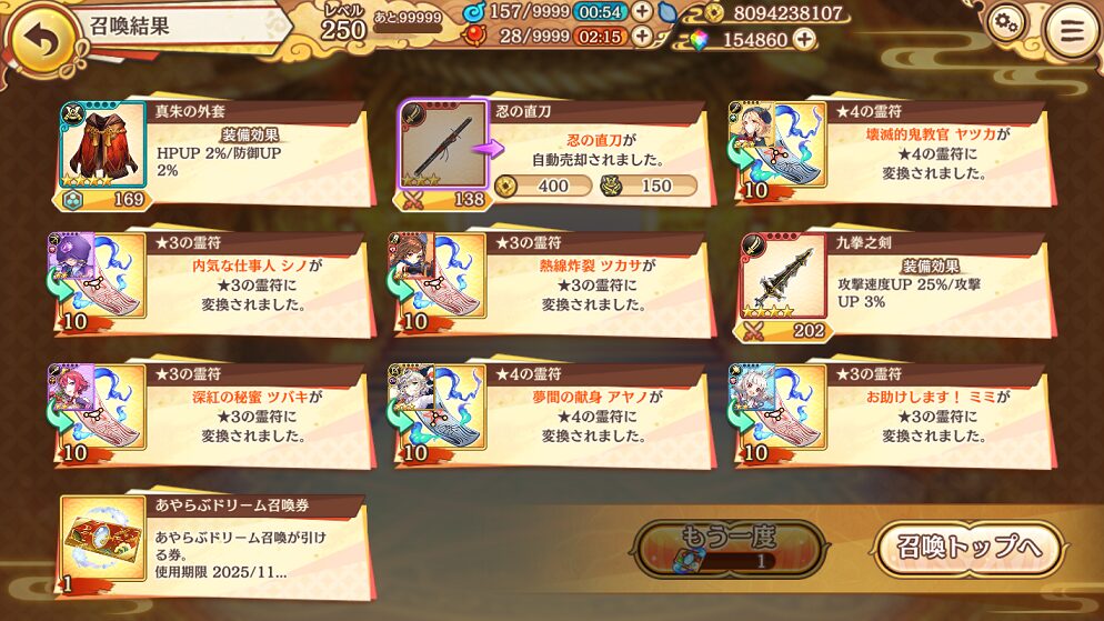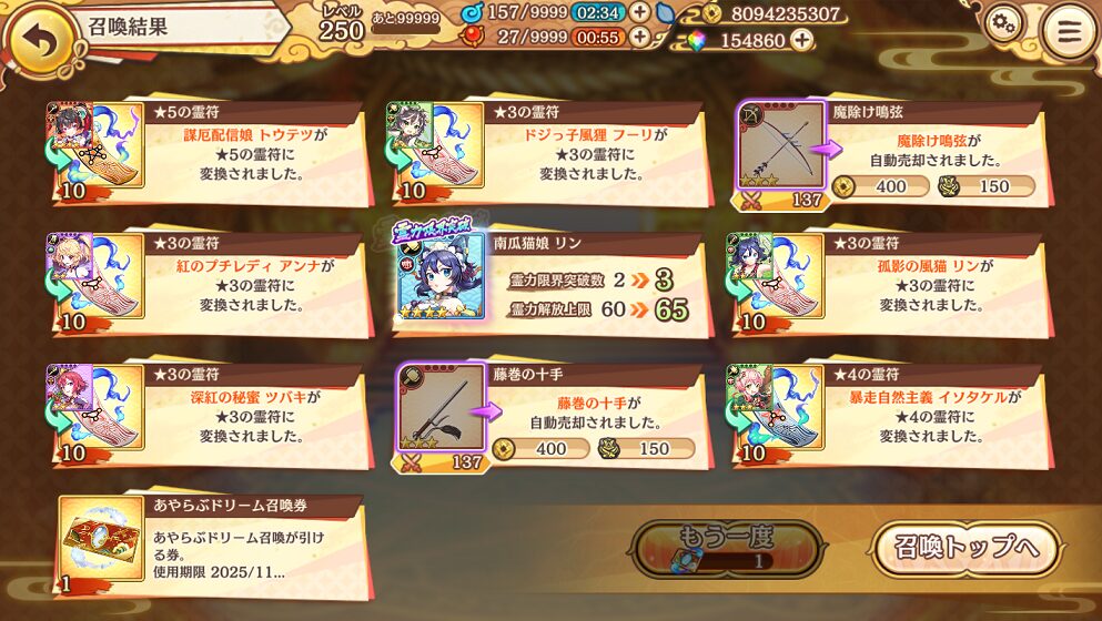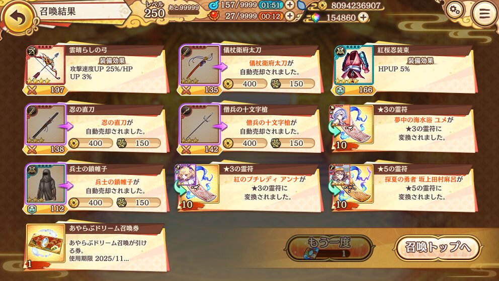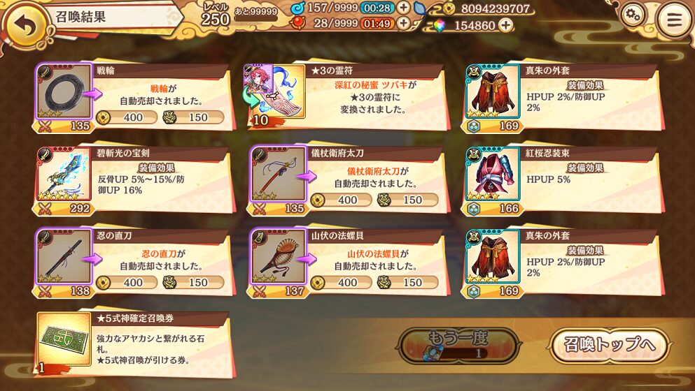 ★5式神確率は3倍の6[%]ですが,★5式神は当たりませんでした.