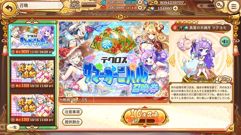 なので,今回はテクロスサマーカーニバル召喚券を15枚使います.