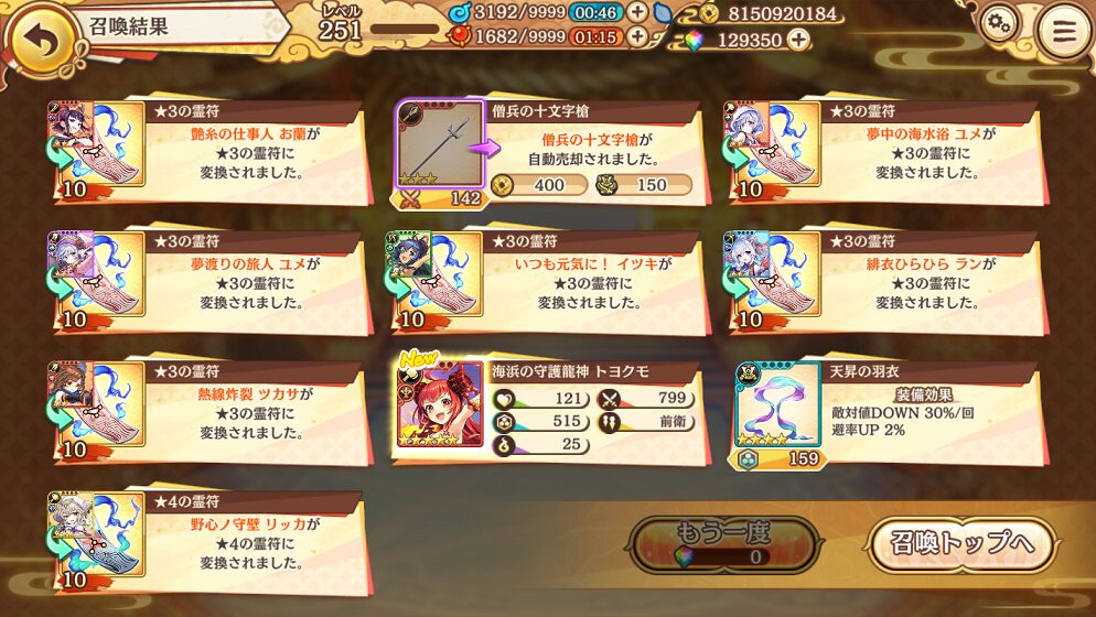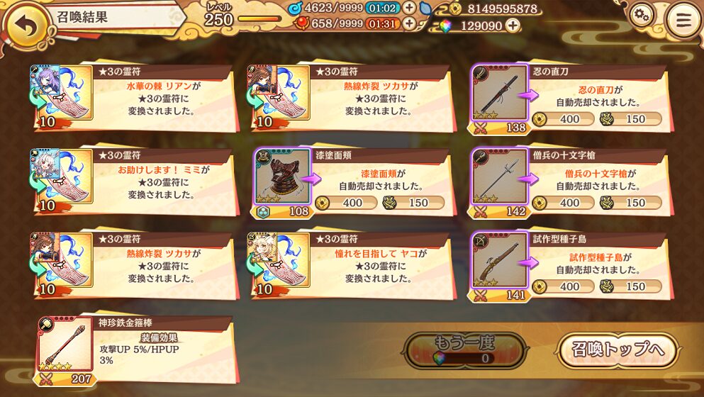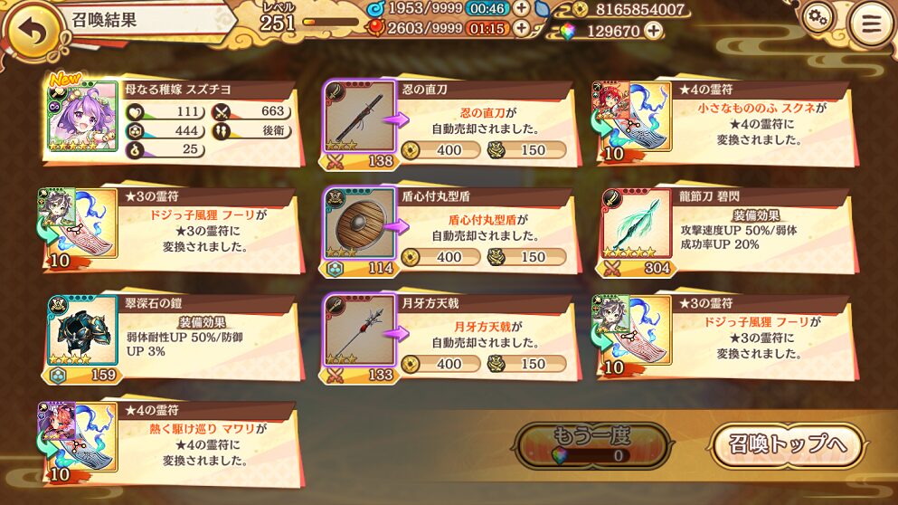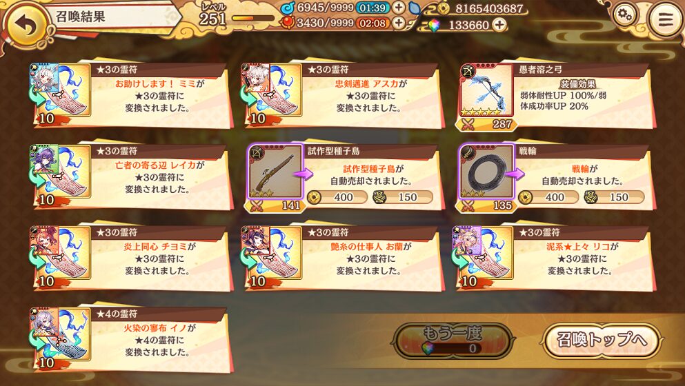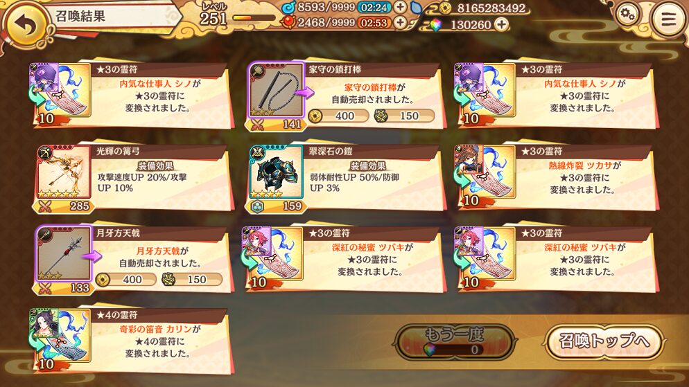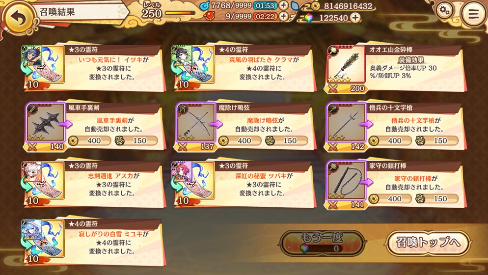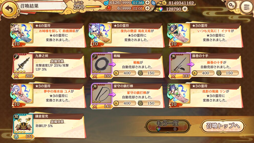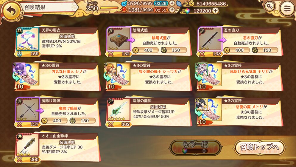 今回の100連で当たった★5は式神3体&装備4個でした.