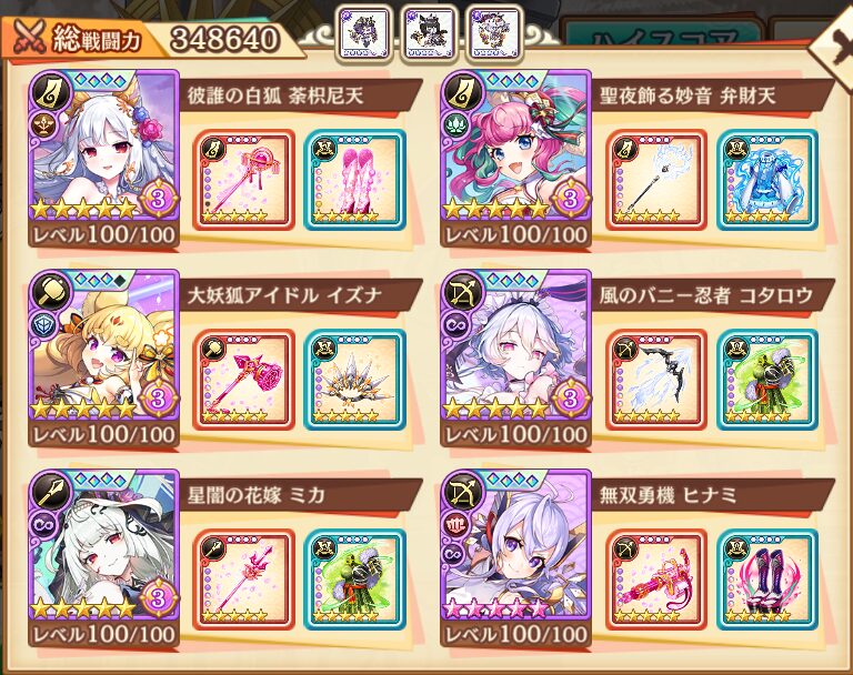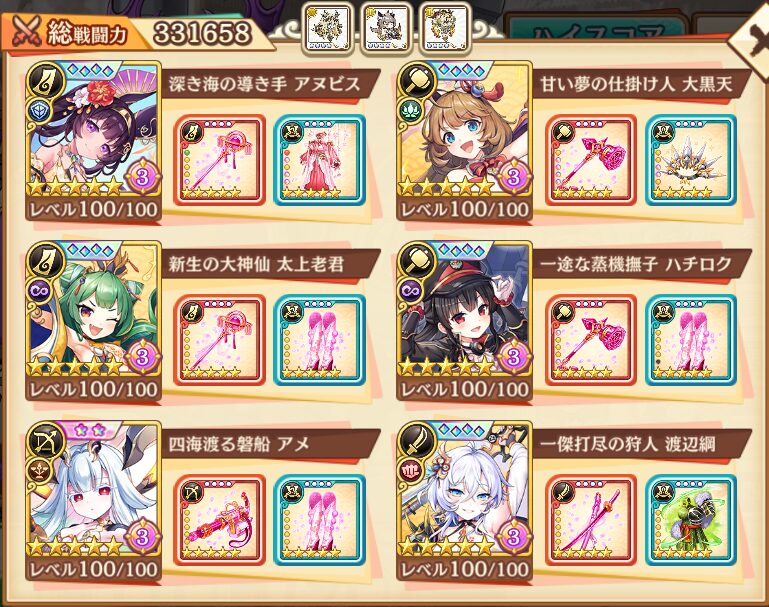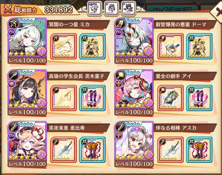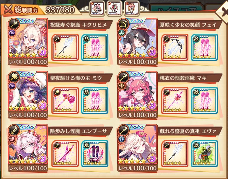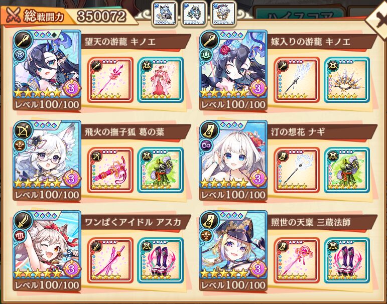 上記編成から1人抜いて攻勢に魔禍の般若刀 アヤノや星降の月母 ツクヨミ廻を編成している場合もありました.