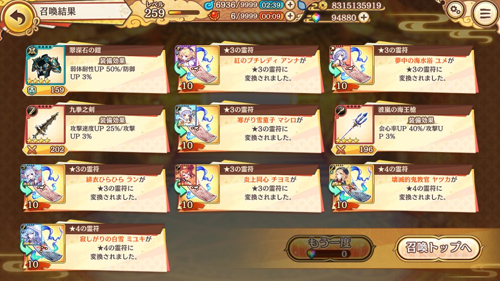 6. 12月31日の無料10連ガチャの結果