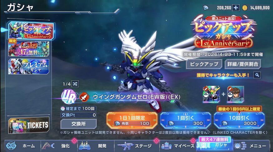 2026年4月1日にウイングガンダムゼロ(EW版)(EX)とダブルオーライザー(最終決戦仕様)(EX)とトールギスⅢ(EX)をピックアップしたガチャが開催されました.