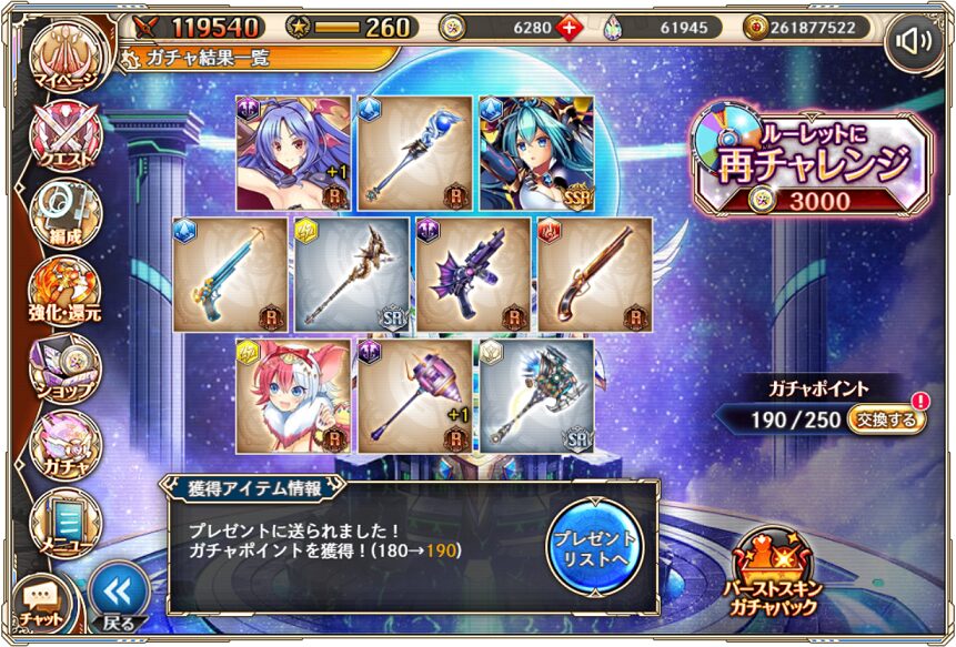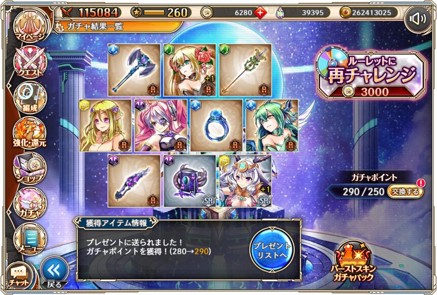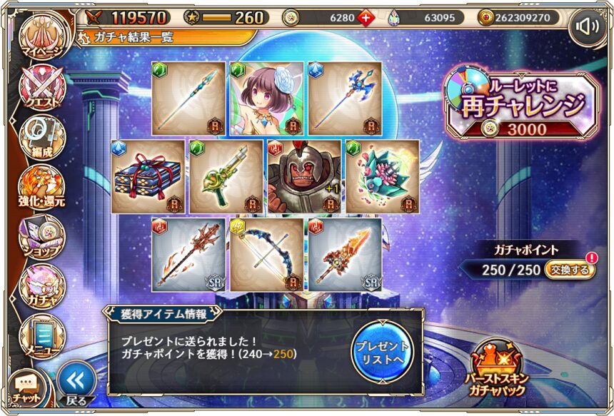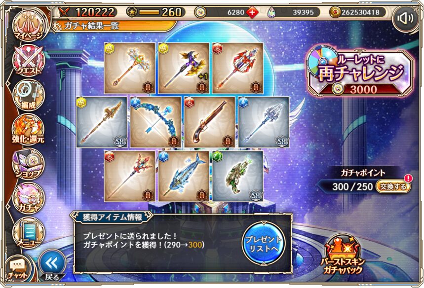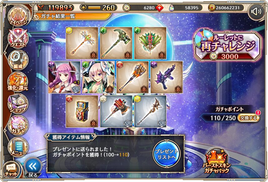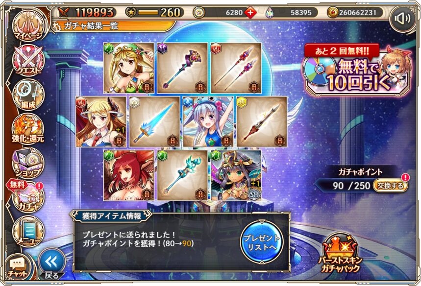 12. 1月11日の無料ルーレット10連ガチャ結果(通算290連)